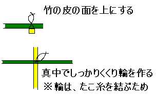 | B | 骨を作る | 竹とひのき棒をたこ糸でくくりつける。(印をつけたところ)